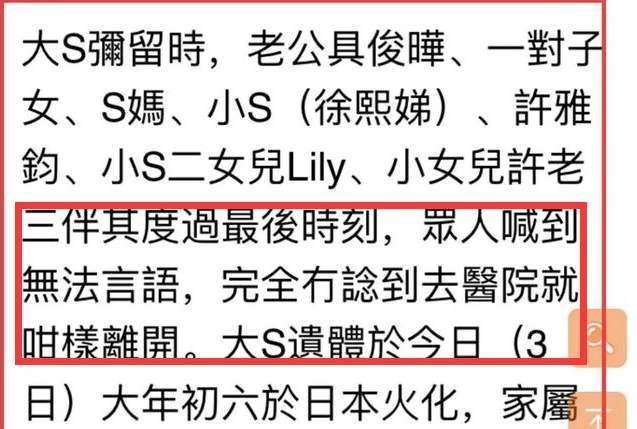 据台媒形容称,大S去世的时候,家人全部在其身边,这其中包括小S许雅钧夫妇、S妈、一双儿女、老公具俊晔,众人哭到无法言语,完全没有想到会是这样的结果。