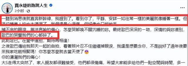 对比来说,贾永婕的悼念和叙述更为详细。听闻噩耗后,她便直接奔赴其所在的医院,看到其临终的模样,就像是往常一样睡着了一样:这位睡美人你也太潇洒了,我们还是心很痛,但好像也只能放手。
