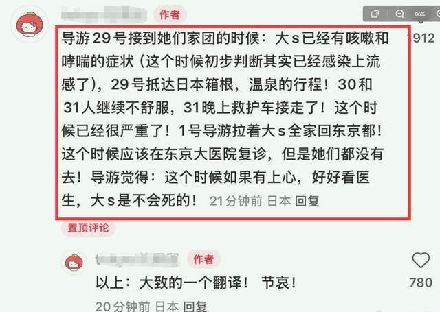 由于大S是在日本去世,所以细节以及临终时的画面,其家人并没有透露分毫,但从好友的发文以及导游的曝料中不难发现整个临终画面,可谓是催人泪下。
